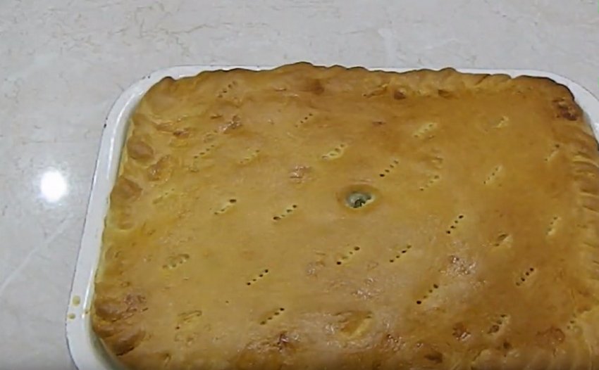 Деко поставити в розігріту до +180°С духову шафу, випікати 40-45 хвилин. Готовий пиріг дістати з духовки, накрити рушником і дати постояти 10 хвилин.![]()