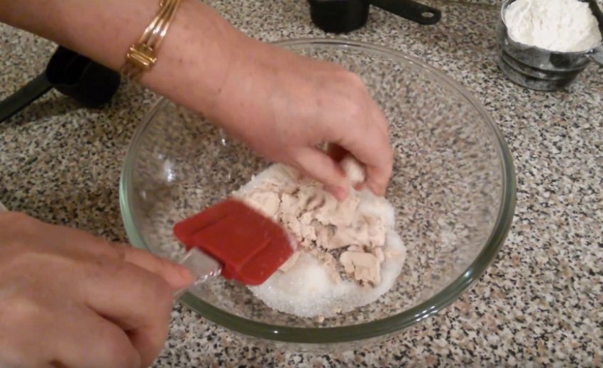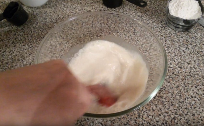 Дріжджі викласти в миску, додати 1 ч. л. солі, цукор і розтерти. Ввести склянку теплого молока і перемішати.![]()