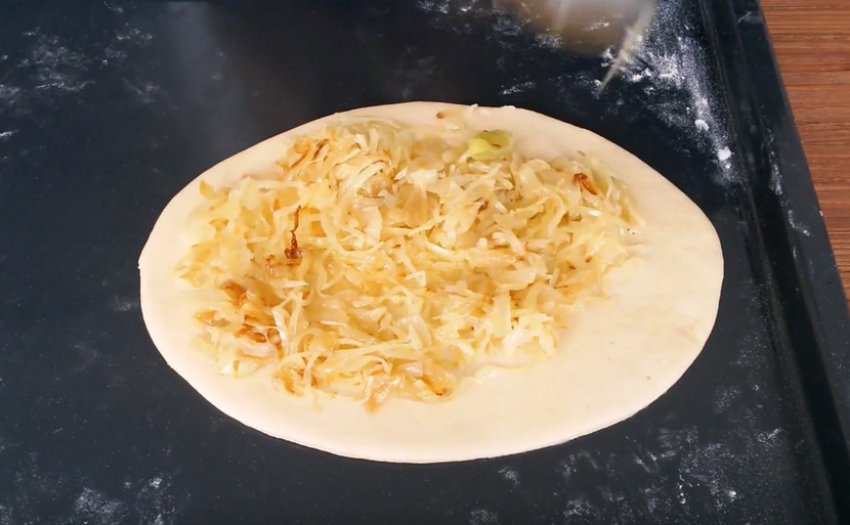 Капусту нашаткувати або дрібно порубати і злегка обсмажити на сковороді разом із подрібненою цибулею. Остиглу капусту викласти на тісто, додати сіль, перець.![]()