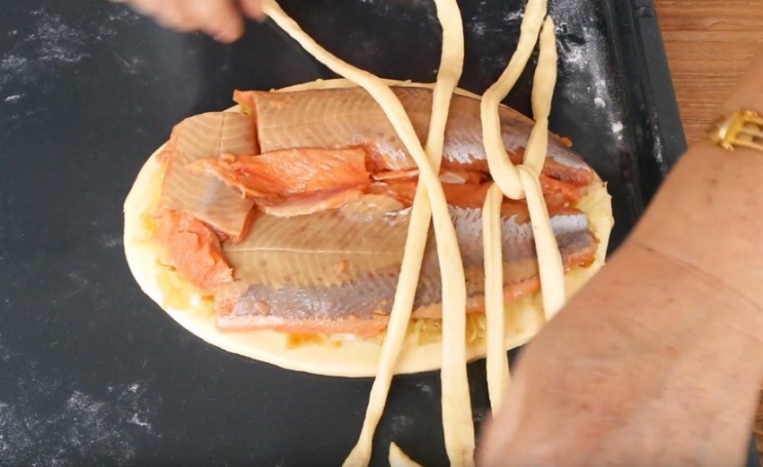 Від тіста відокремити 1/3 частину, яка буде надалі слугувати для оформлення ажурного верху. Іншу масу розкачати, можна за допомогою шаблону надати йому форму риби. Заготовку викласти на змащене деко.![]()