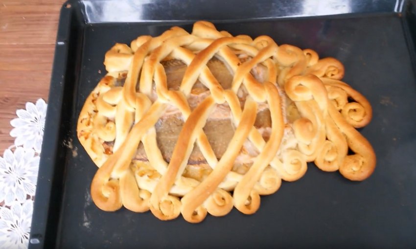 Тісто, що залишилося, розкачати, нарізати смужки товщиною близько 1 см. Прикрасу верху пирога зі смуг роблять різними способами: укладають їх навхрест, формують петлі тощо. Безліч наочних варіантів оформлення можна знайти в інтернеті.![]()