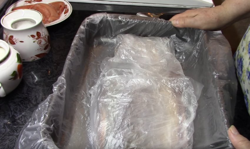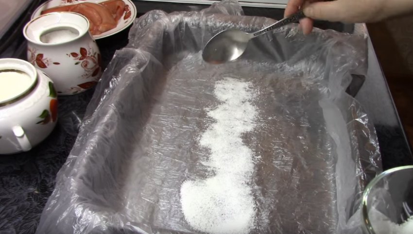 Застелити форму для запікання поліетиленом. На дно насипати 1 ст. ложку посолочної суміші.![]()