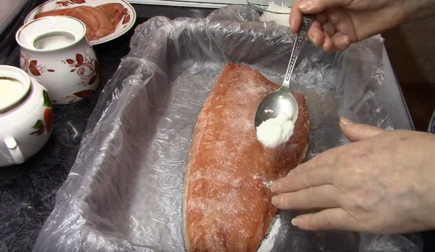 Зверху посипати шкуру верхнього шматка посолочною сумішшю. Накрити поліетиленовою плівкою.![]()