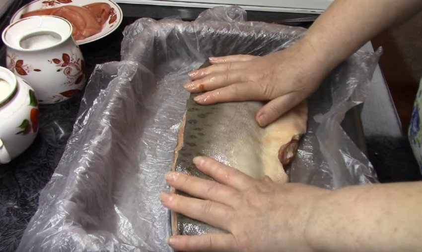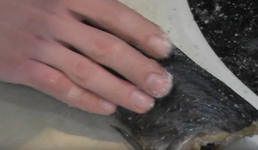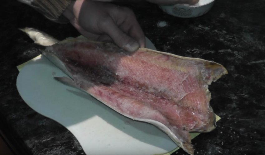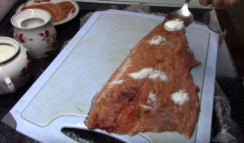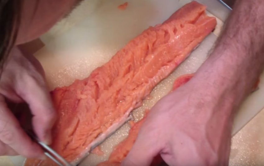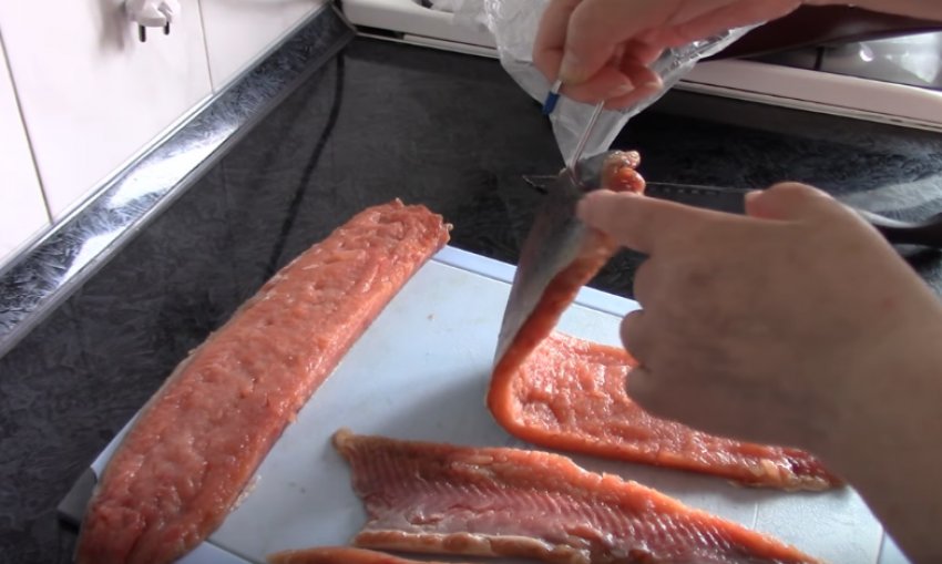 Видаляють кістяк. Потім потрібно провести пальцем по поверхні, знайти і видалити всі дрібні кістки, які залишилися у філе. Витягувати їх важко, тому скористайтеся пінцетом або плоскогубцями. Сухий посол риби вважається одним із найшвидших і найакуратніших способів переробки.