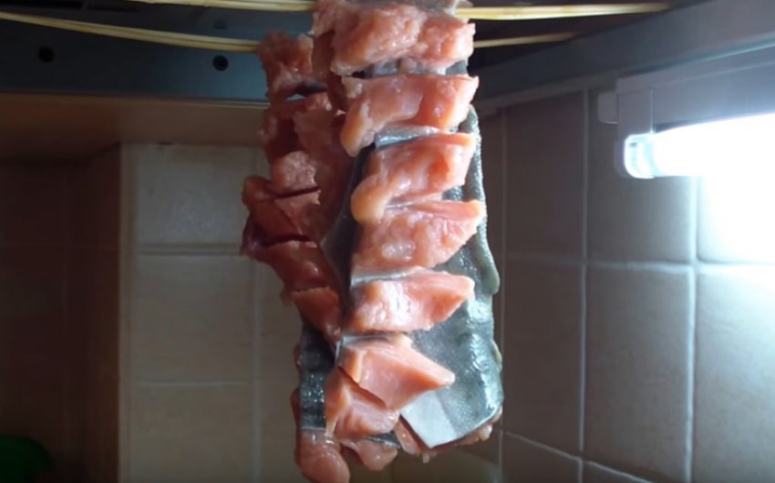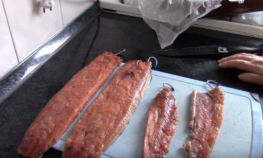 Через 2 доби риба майже готова. Її потрібно обсушити паперовими рушниками, а після розрізати на окремі шматки і нанизати їх на гачки.![]()