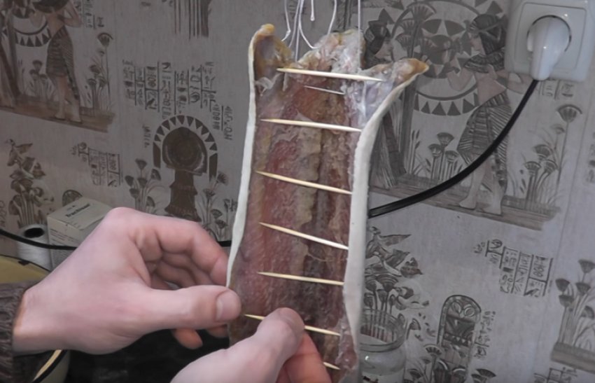Підсушувати на балконі протягом доби під вентилятором за температури +18°С. Зберігати таку закуску потрібно загорнутою в пергаментний папір у холодильнику.![]()