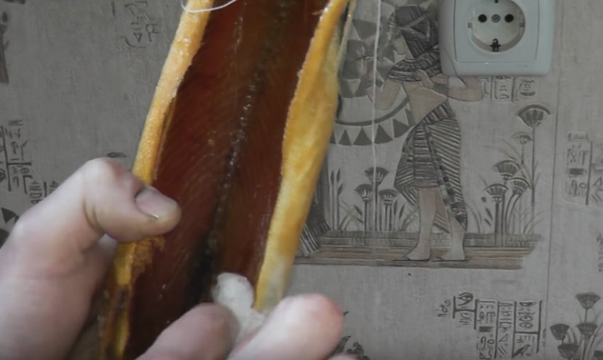 Через 8 днів палички видаляють, а потім спонжем, змоченим у соняшниковій олії, протирають рибу зсередини і зовні.![]()