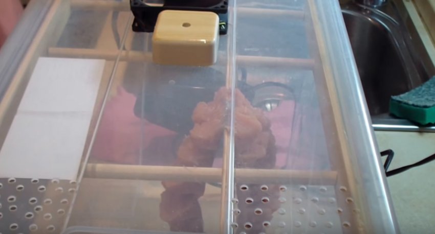 Якщо у вас є пластиковий контейнер, то в ньому можна просвердлити дірки для вентиляції і підвісити там горбушу на 2 доби або залишити висіти в приміщенні кухні.![]()