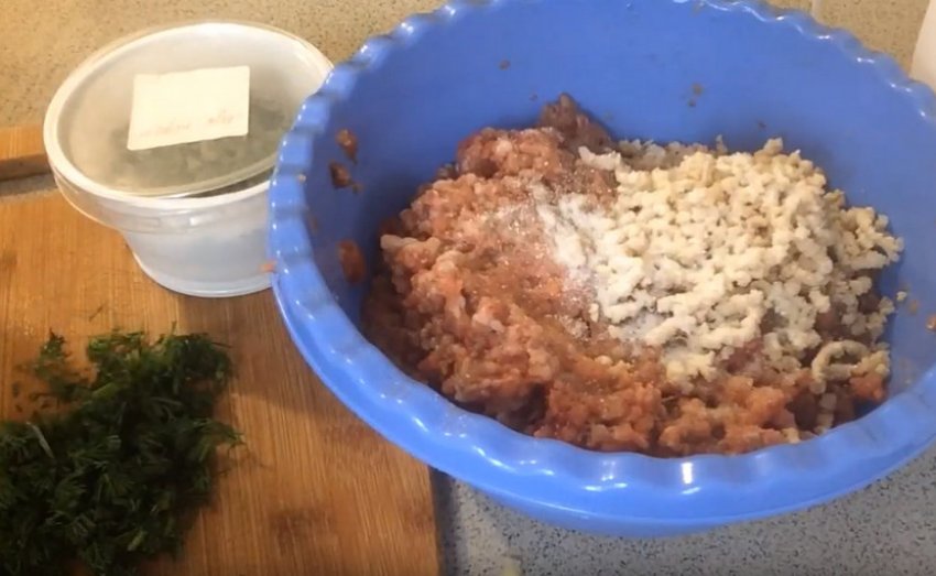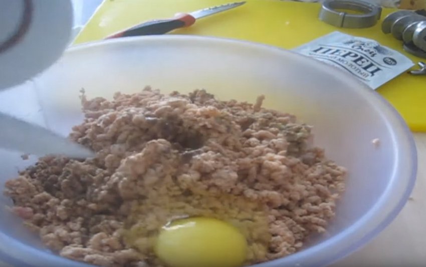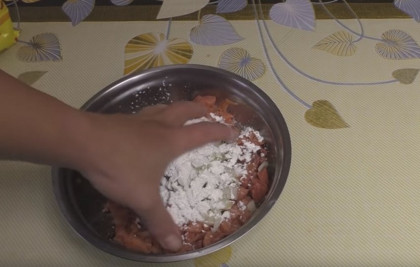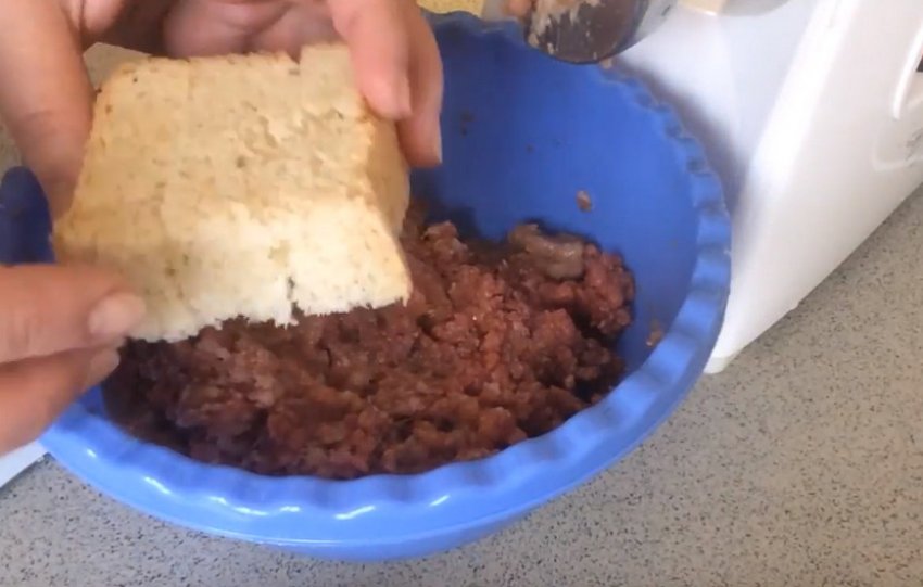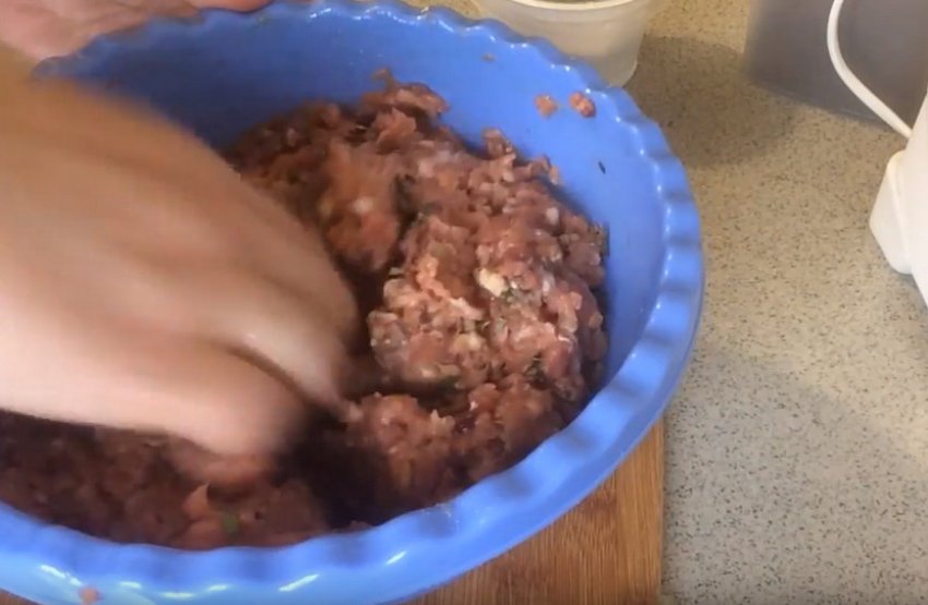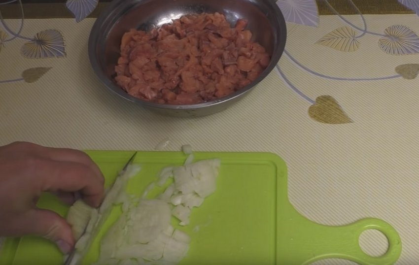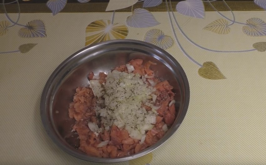 - М'ясисту м'якоть і одну середню цибулину необхідно розрізати на середні шматки. Потім їх подрібнюють кухонним комбайном. Також перекручують сало і часник. Посоліть усе, додайте універсальну приправу. Усі компоненти слід ретельно перемішати.
