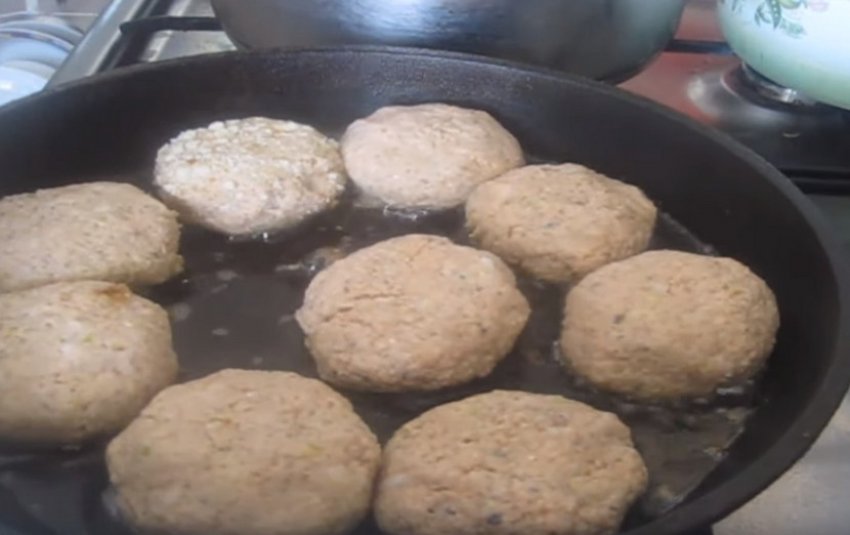 - На розпечену пательню додайте олії, почекайте, поки вона розігріється. Потім викладайте сформовані кулі. Підрум'яньте на середньому вогні обидва боки. Обсяг котлет під час термообробки збільшиться вдвічі.