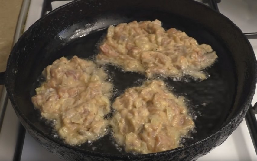 - Потім слід на розпечену пательню влити трохи олії, зачекати, доки вона почне закипати, і тоді руками або столовою ложкою викладати м'ясо плоскими круглими шарами.