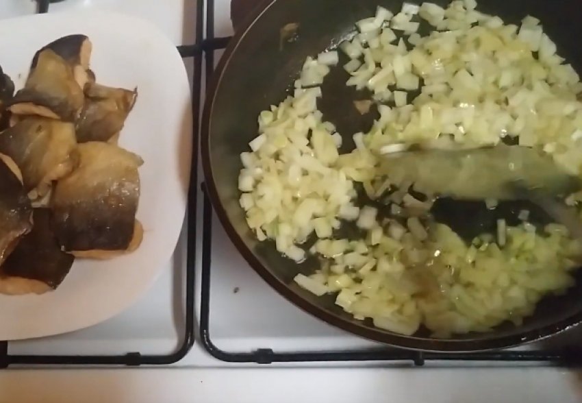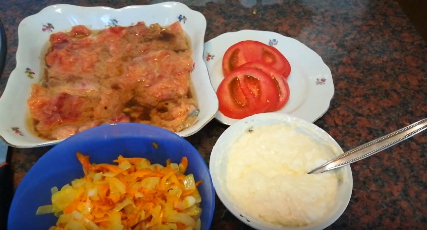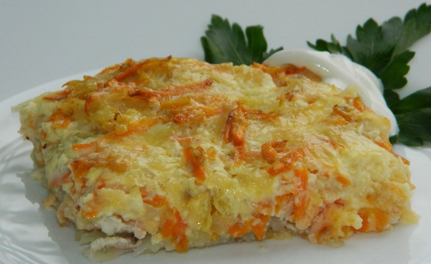 На рибу, що залишилася, розкладіть пасеровану моркву з цибулею, потім покрийте "шапкою" з сиру і майонезу.![]()