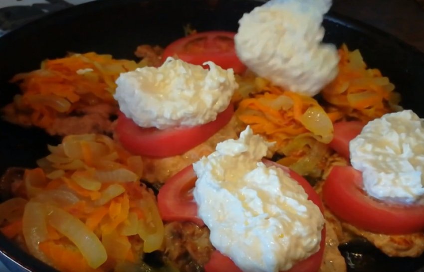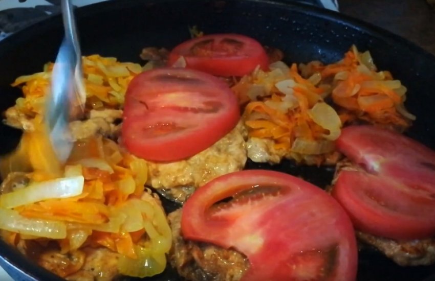 Не вимикаючи вогонь, на половину порційних шматків риби покладіть помідори і зверху рівномірно розподіліть ложкою сирно-майонезну суміш.![]()