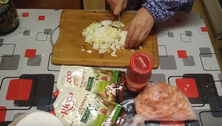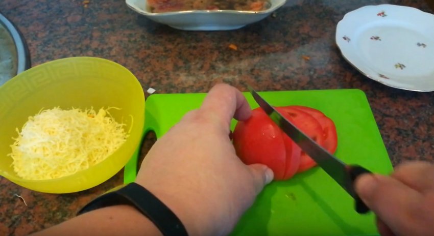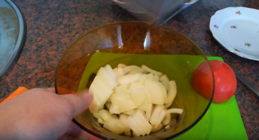 - Подрібніть картоплю, томати і ріпчасту цибулю півкільцями.
