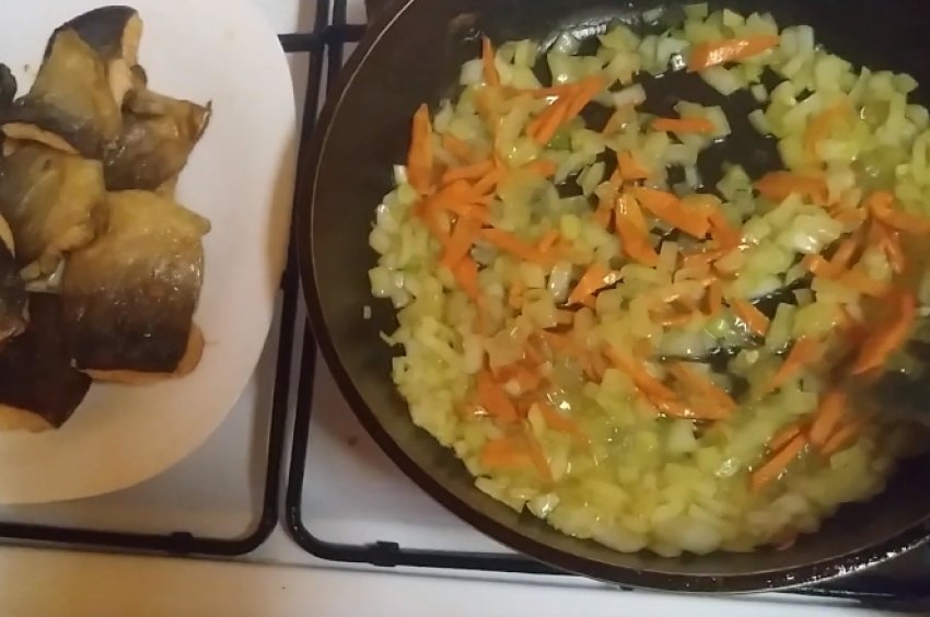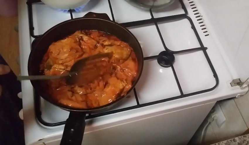 Покладіть до цибулево-морквяної суміші попередньо підготовлену рибу, залийте соусом і тушкуйте під закритою кришкою на мінімальному вогні протягом 20 хвилин.![]()