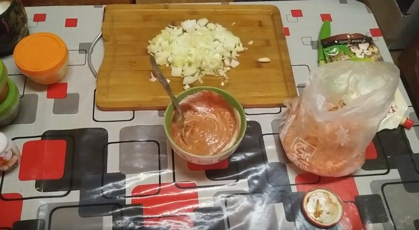 Змішайте в окремій ємності томатну пасту, майонез, сіль, чорний і червоний перці, куркуму, воду, лимонний сік і перемішайте до однорідності.![]()