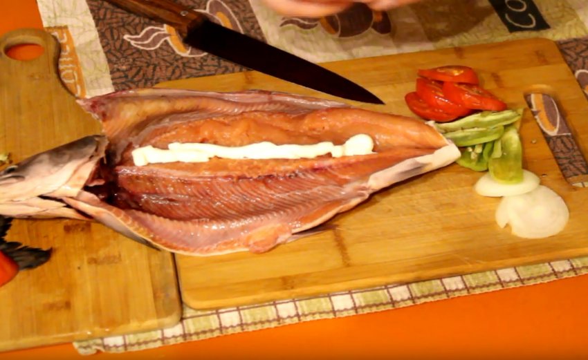 Посоліть, поперчіть і натріть її соняшниковою олією всередині та зовні. Змастіть внутрішню частину майонезом. Надріжте овочі: цибулю - кільцями, перець - смужками, а помідори - кружечками.![]()