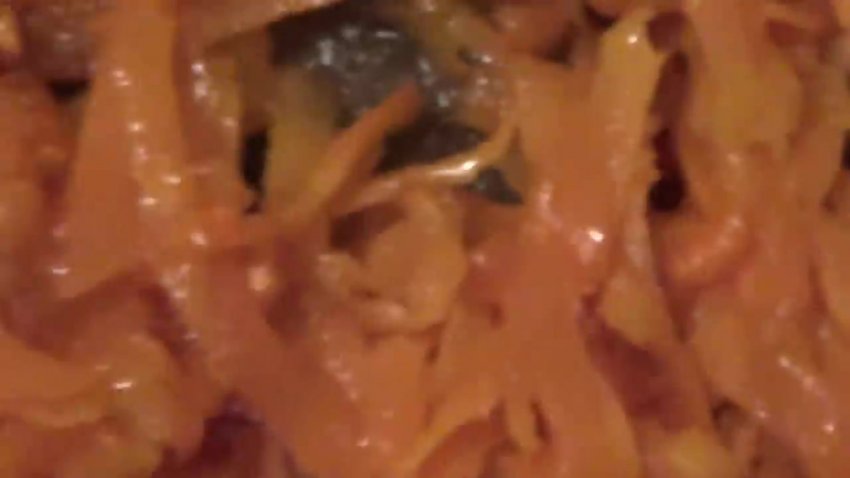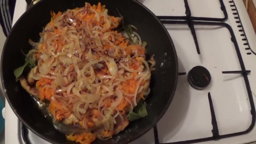 На обсмажені рибні шматки викласти спочатку тушковану моркву, а потім цибульну масу. Перемішувати не треба.![]()