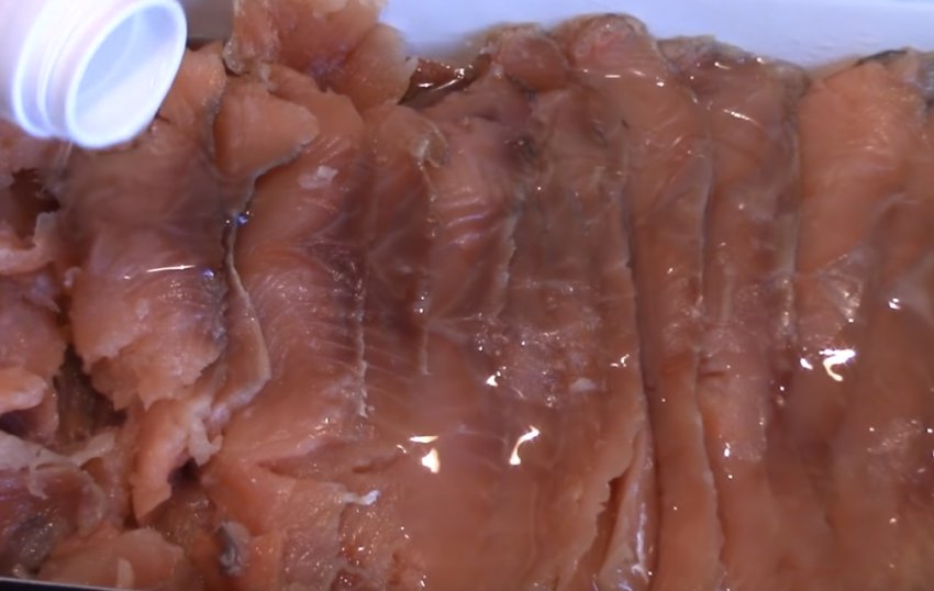 Після закінчення часу дістати філе, можна замаскувати його під сьомгу. Для цього потрібно нарізати горбушу на тонкі скибочки.![]()