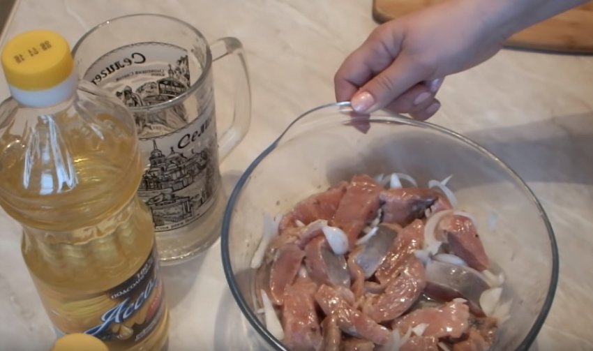 - У ємності з високими бортами (щоб зручно було мішати) з'єднати сіль, перець, горбушу, цибулю, соняшникову олію і видавити туди лимон. Усе це старанно перемішати, закрити кришкою і заховати в холодне місце.