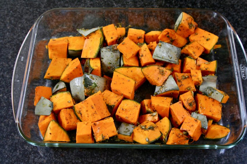Викладіть шматочки гарбуза на деко. Застелене пергаментом, або у форму для запікання, а зверху полийте олією, посипте коричневим цукром і морською сіллю, а також меленою корицею і сухим розмарином. Усе це потрібно рівномірно розподілити по гарбузу й акуратно перемішати.
