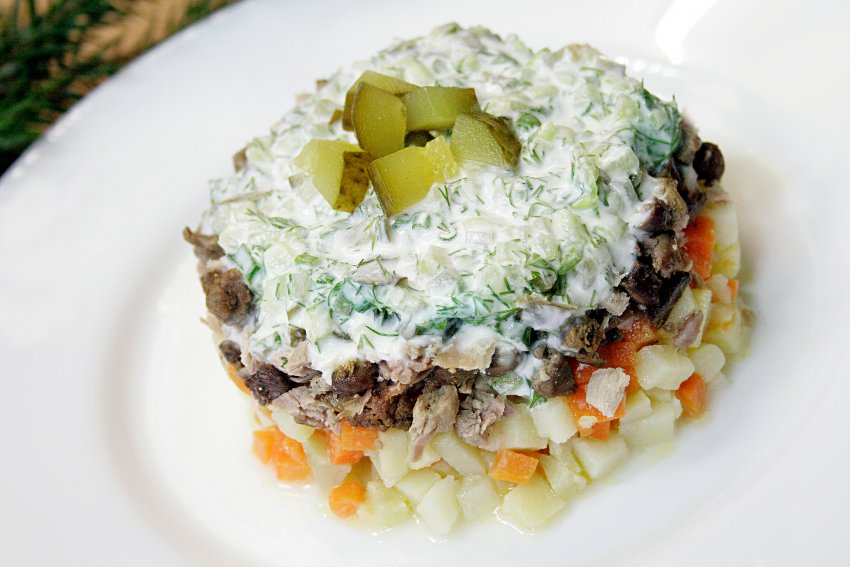 Пропонуємо вашій увазі салати з яловичого серця з морквою, бобами та пікантними маринованими огірками.