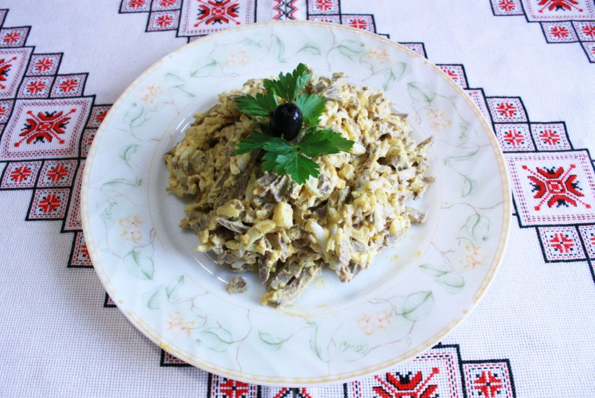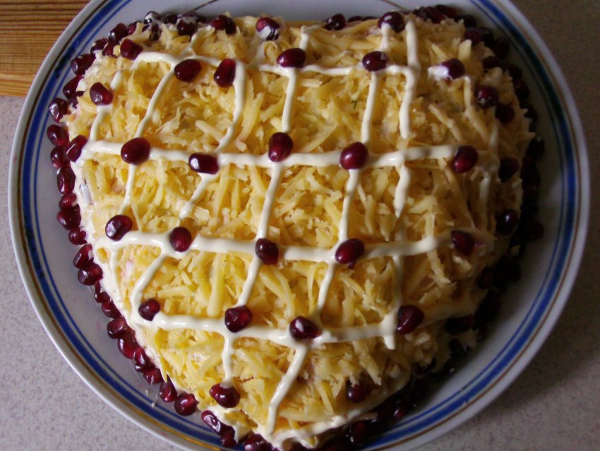 Черговий шар - соломка з вареного серця. Ще шар майонезу, який покриває шар натертого на дрібну тертку твердого сиру. Приємного апетиту!