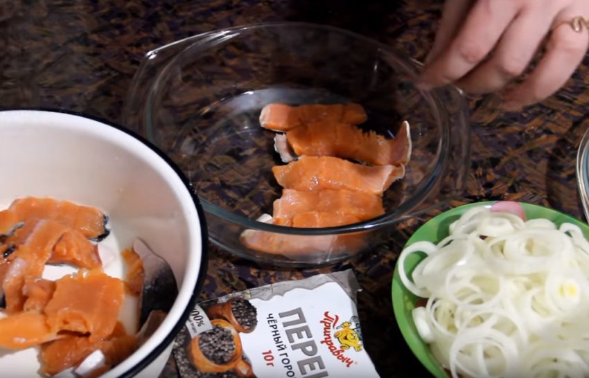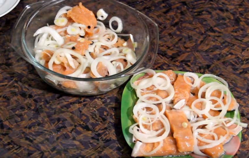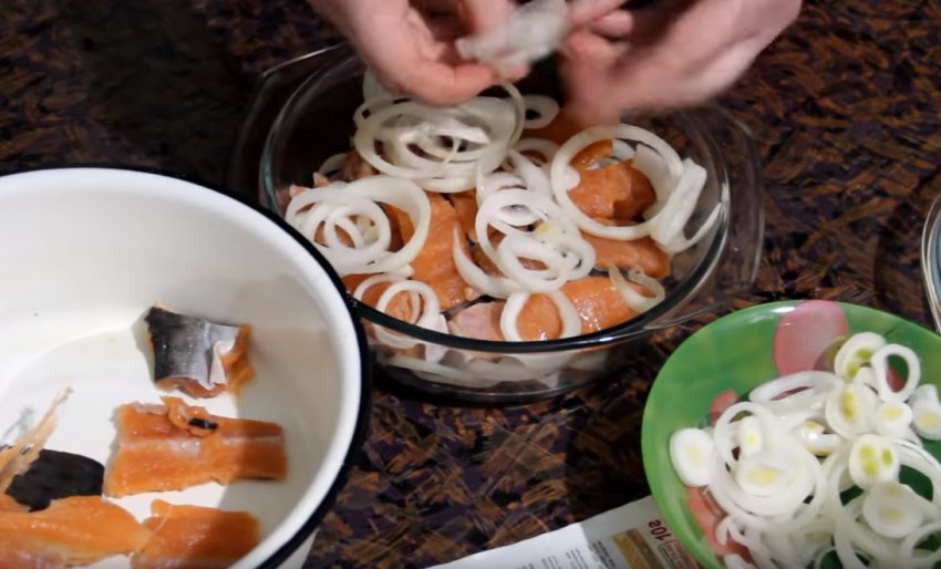 Цибулю нарізати тонкими кільцями (можна півкільцями). В окрему ємність, у якій ви плануєте подавати горбушу на стіл, викласти одним щільним шаром рибу, рясно присипати цибулею, покласти 10 горошин чорного перцю, за бажанням можна додати кілька лаврових листків.![]()
