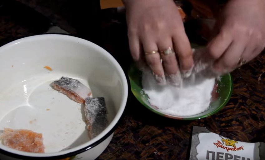 Сіль насипати в неглибоку миску і по черзі повністю вмочити в неї кожен шматок горбуші.![]()