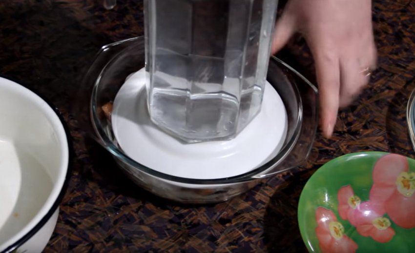 Зверху залити рибу олією і поставити під гніт. Якщо у вас страва круглої форми, прес можна зробити так: покласти на рибу перевернуту догори дном тарілку, а наверх поставити банку з водою. Рибу залишити маринуватися на 1,5 години, щоб вона встигла пустити сік, насититися олією, цибулею і перцем. Після цього продукт можна подавати на стіл.![]()