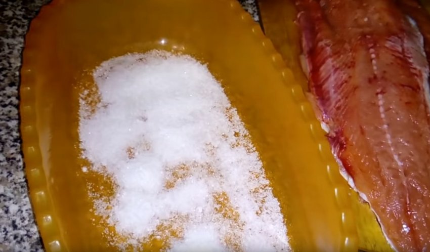 На дно ємності насипати суміш солі з цукром, приблизно 2-3 ложки. Покласти одне філе внутрішнім боком догори, рясно обробити цукрово-сольною сумішшю. Поверх викласти другу частину риби зовнішнім боком догори і знову посипати.![]()