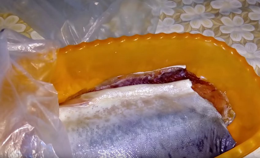 Ємність обгорнути харчовою плівкою і залишити в холодильнику на 14-16 годин. Після закінчення зазначеного часу, розпакуйте рибу і спробуйте невеликий шматочок.![]()