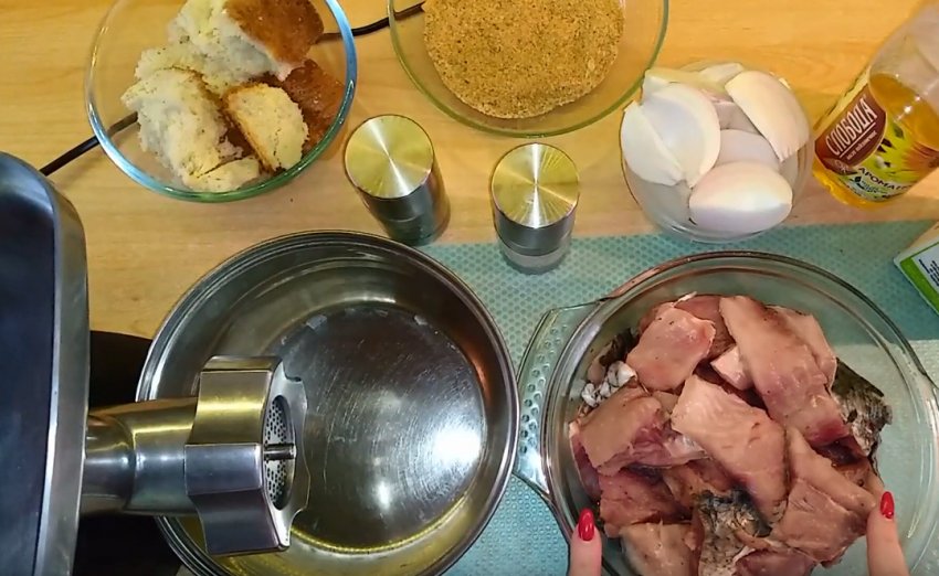 - Очищене філе сазана пропустіть 2 рази через м'ясорубку. Щоб у готовому фарші було якомога менше рідини, краще використовувати охолоджене, а не заморожене рибне філе.