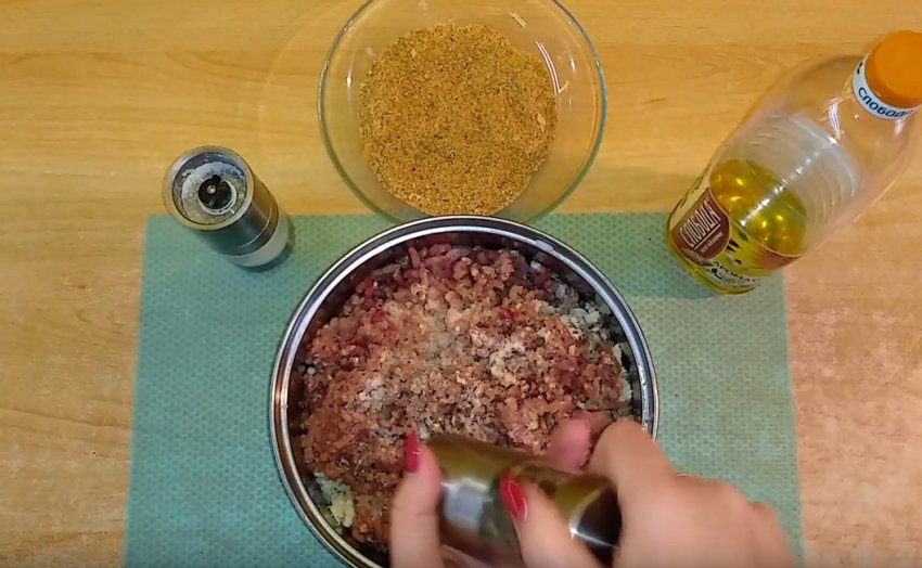 Пропустіть через м'ясорубку хліб і цибулю, а потім перекладіть їх до фаршу, посоліть і поперчіть суміш на свій смак.![]()