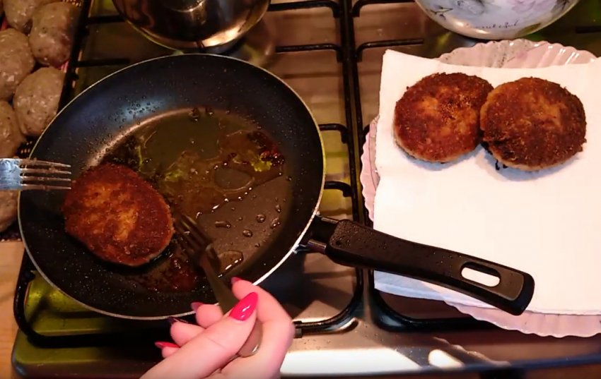- Обваляйте котлети в борошні, обтрусіть зайву кількість і обсмажте з двох боків: спочатку на середньо-сильному вогні до появи рум'яної скоринки з обох боків, а потім - на меншому, прикривши кришкою (до повної готовності). Під кришкою астраханські котлети виходять не такими пересушеними і зберігають свою максимальну соковитість, що сприятливо позначається на їхніх смакових характеристиках.