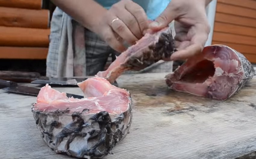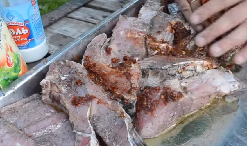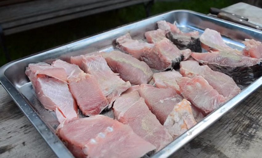 почистити від луски. Хвіст, плавники та голову відрізати. Після чого порубати риб'ячу тушку на стейки, а потім розділити частини ще навпіл.![]()