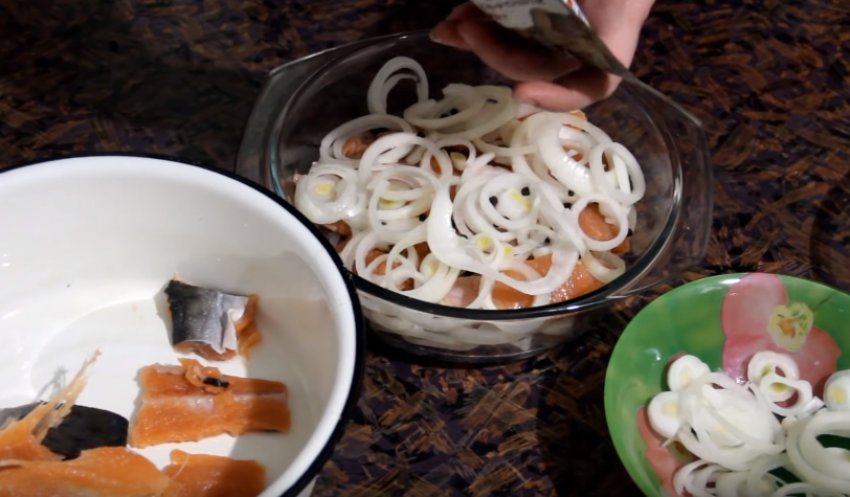 Шматочки знову викласти в ємність, перекладаючи шар горбуші з нарізаною кільцями цибулею і пересипаючи горошинами перцю.![]()