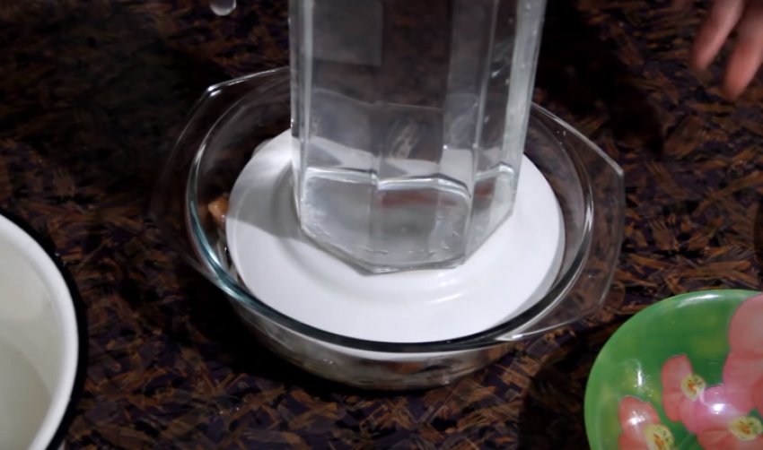 Вміст ємності полити олією, накрити перевернутою тарілкою, поставити зверху невеликий вантаж (банку з водою). Через 1 годину страва готова до вживання. Краще, якщо цей час риба проведе в холодильнику, так вона буде смачнішою.![]()
