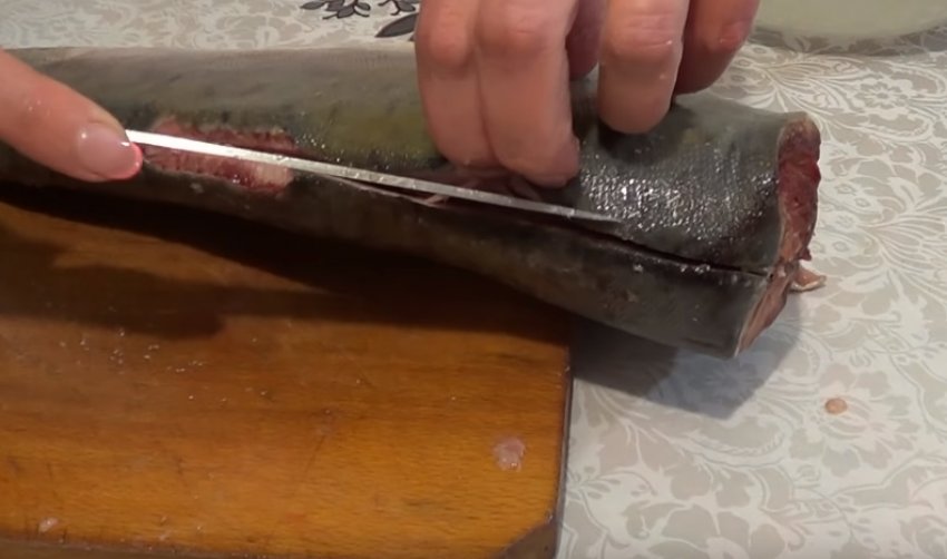 З риби видалити (якщо є) решту нутрощів, хвіст і плавники.![]()