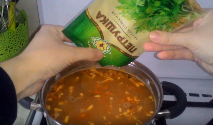 Зварити яйце круто і натерти його на крупну тертку. Відправити його і петрушку в суп і, накривши кришкою, потомити ще 10 хвилин.![]()
