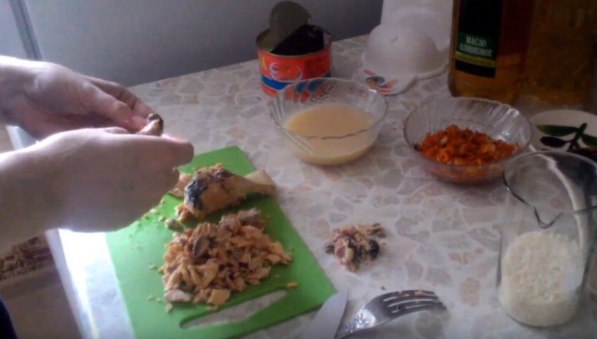 Відкрити консерви, злити рідину в окремий посуд. Рибу розділити руками на дрібні фракції за розміром приблизно з овочевою нарізкою.![]()