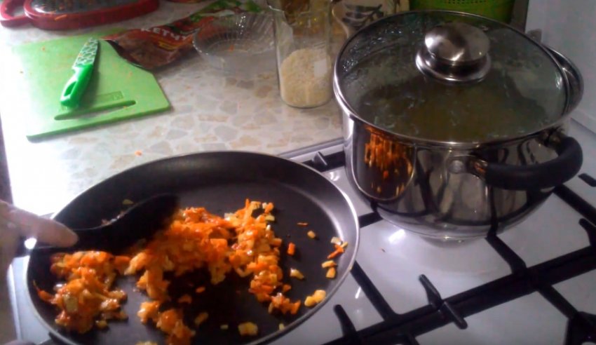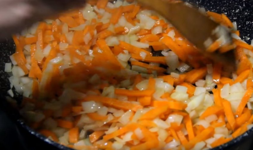 На рослинній олії обсмажити моркву і цибулю, додавши кетчуп, буквально 5 хвилин.![]()