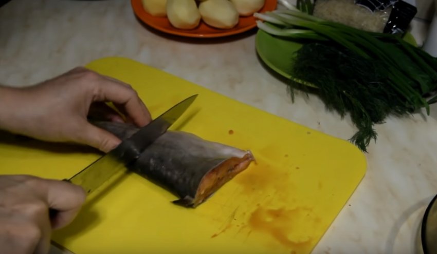 Рибину нарізати шматками довжиною приблизно по 5 см. Голова, хвіст і плавники також підуть в юшку, їх не варто викидати.![]()