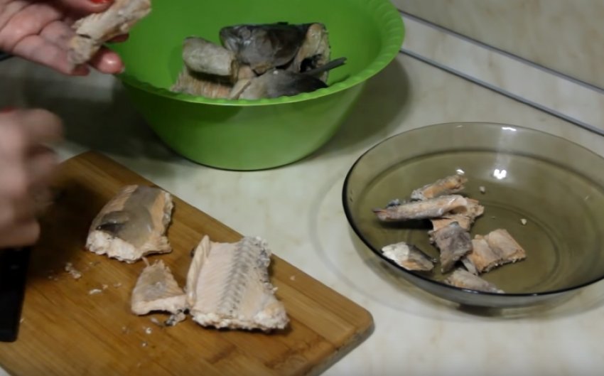 М'ясо риби відокремити від кісток. Розрізати філе на невеликі частини ножем або порвати руками. За бажанням можна видалити також шкіру.![]()