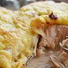 - Дістаньте деко з духовки, залийте збитою яєчно-молочною сумішшю і присипте тертим сиром.
