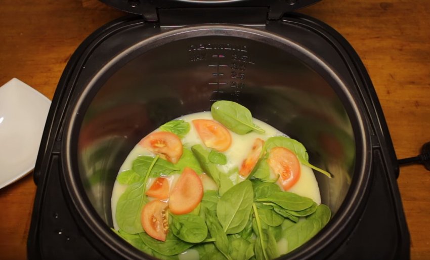 Покладіть зверху рибу, листя шпинату та нарізаний помідор. Готуйте страву в режимі "Випічка" протягом 20 хвилин.![]()