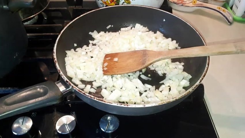 - Обсмажити цибулю і моркву на сковороді з додаванням соняшникової олії до золотистості.
