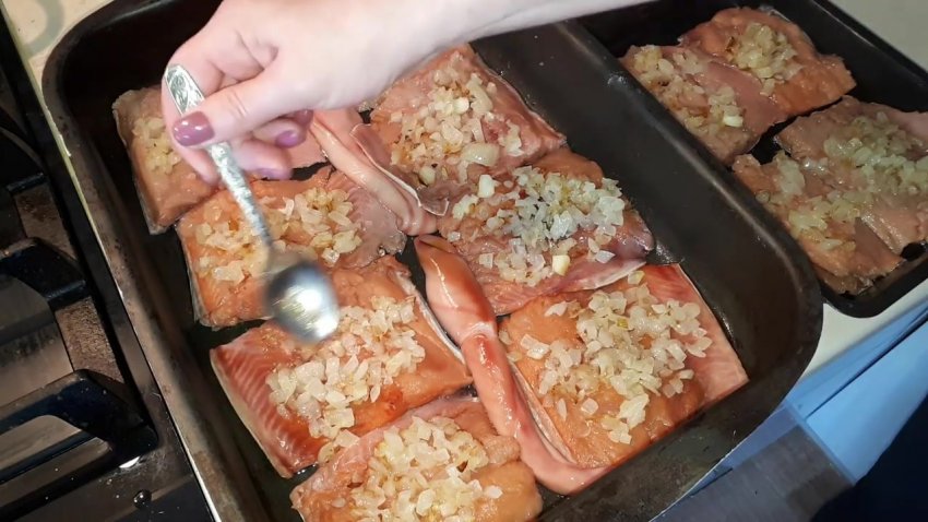 Покласти шматочки горбуші на деко шкіркою вниз, попередньо змастивши їх соняшниковою олією. Розкласти зверху пасеровану цибулю.![]()