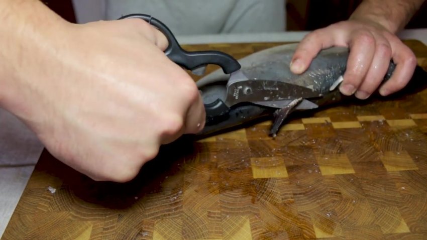Очистити горбушу від луски, нутрощів і зябер. Плавники відрізати кухонними ножицями.![]()