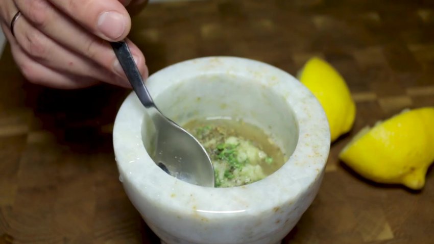 Приготувати маринад для риби: змішати трави прованські, коріандр, чебрець, сіль, перець мелений, подрібнений часник і сік половини лимона.![]()